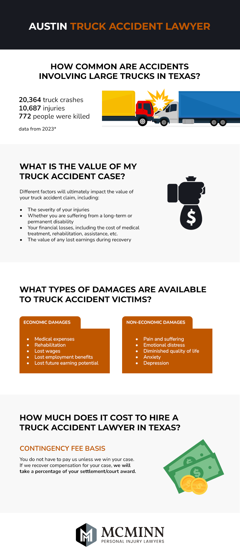 If you or a loved one was recently injured in a truck accident in Austin, TX, you may be entitled to financial compensation. Our team at McMinn Personal Injury Lawyers is here for you. An experienced Austin truck accident lawyer can help you fight to recover compensation for medical bills, lost wages, and more.